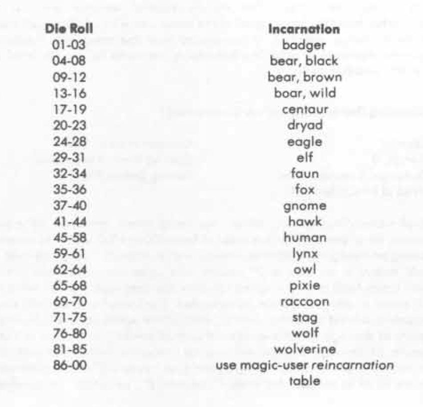 The table below gives the reincarnation possibilities of this spell: A d20 for the first two digits, where 20 counts as 0, and a d10 for the last digit) and consult the table. If the target's soul isn't free or willing to do so, the spell fails.
